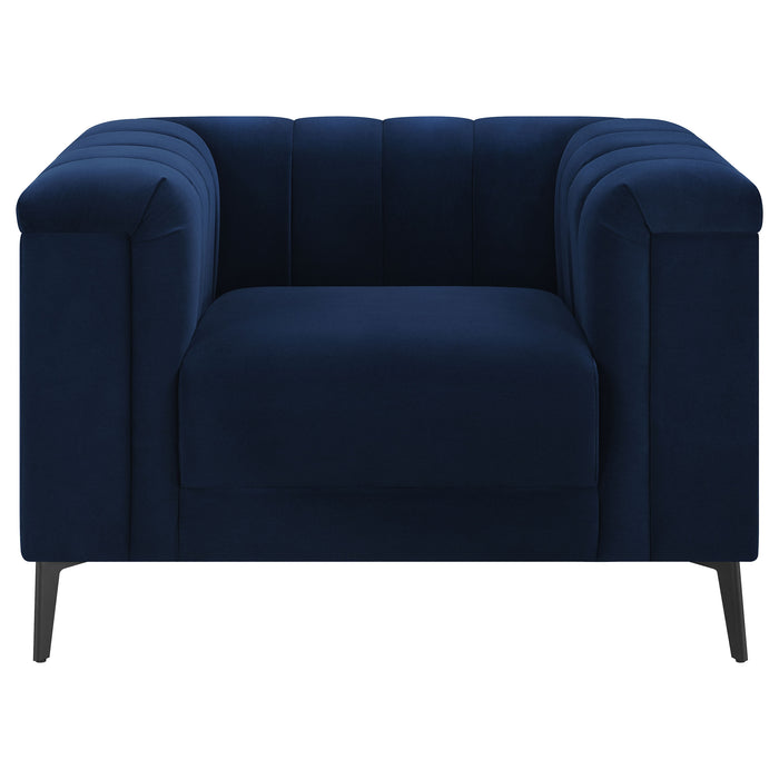 Wrapped in a bold navy blue matte velvet, this sofa and loveseat features shelter back style with vertical, channel tufted interiors. Each piece features a tight waterfall bench seating supported by tapered black metal legs. The arms of each piece roll gently outward, displaying the channel tufting. This set is perfectly suited for a contemporary home that needs a touch of glamour. Its deep, blue tone evokes an elegant nautical vibe, like being on a yacht.