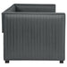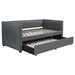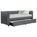 A gray fabric, pleated and overlapping along the surface of this twin daybed and trundle set, create a textured appearance against the clean straight lines. The narrow arms and backrest invite you to get creative with your own accent pillows and throws, opening this furniture piece up to becoming a lounge sofa or a bed for additional overnight guests. A trundle slips beneath the main frame when not in use or can be retrieved and glided out effortlessly. Black finish feet add slight elevation and a pop of contrast against flooring and rugs too. This twin daybed trundle set is the perfect addition for compact, multipurpose spaces like home offices and guestrooms. Key Features: • With its thin, pleated, fabric details, this shelter back daybed features exceptional tailoring throughout • Relax in comfort with this sleeping, lounging, daybed must-have • Perfect for smaller living areas, convenient pull out trundle for extra sleeping space when needed • Upholstered in grey fabric • Frame constructed with pine and MDF • Slat kits included