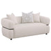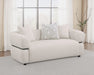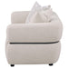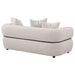 With a striking silhouette and artistic presence, this sculptural loveseat pairs bold form with inviting comfort. A distinctive solid wood waistband traces the frame, emphasizing its contemporary curve. Textured beige upholstery wraps the waterfall bench seat in a tailored embrace, punctuated by plush down and feather blend accent pillows. Constructed with pocket coil support for durability, this loveseat becomes an eclectic focal point in modern living spaces. Key Features: • Sculptural loveseat design features a waterfall seat and bold solid wood waistband detail • Includes accent pillows with textural covers and zippered closures • Pocket coil seating delivers durable support and lasting cushioned comfort • Upholstered in soft, woven polyester with tailored piping and tonal texture • Frame built from eucalyptus, engineered wood, and structural hardwood blend • Low back, deep seat, and curved form add bold softness to contemporary interiors