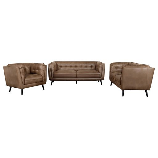 Transform your mid-century modern living room seating area with this contemporary shelter style lounge chair, designed in an updated Chesterfield style complete with plush grid tufted seats and cushions upholstered in a soft and smooth brown microfiber leather. Lending a bold vintage flair are tall, tapered, dark brown legs that offer definition along with the welt trim edges of the cushions.