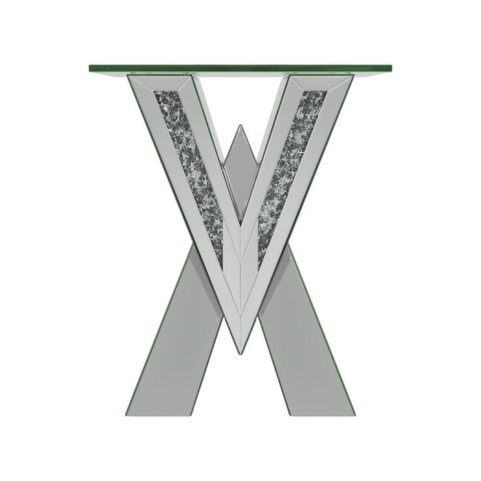 This mirrored end table brings a bold, artistic flair to any living space. Its striking V-shaped base features mirrored panels and glittering crystal accents, creating a glamorous and reflective design. Topped with a square, beveled tempered glass surface, this piece offers a perfect blend of style and functionality. The sculptural silhouette makes it an eye-catching focal point for modern interiors.