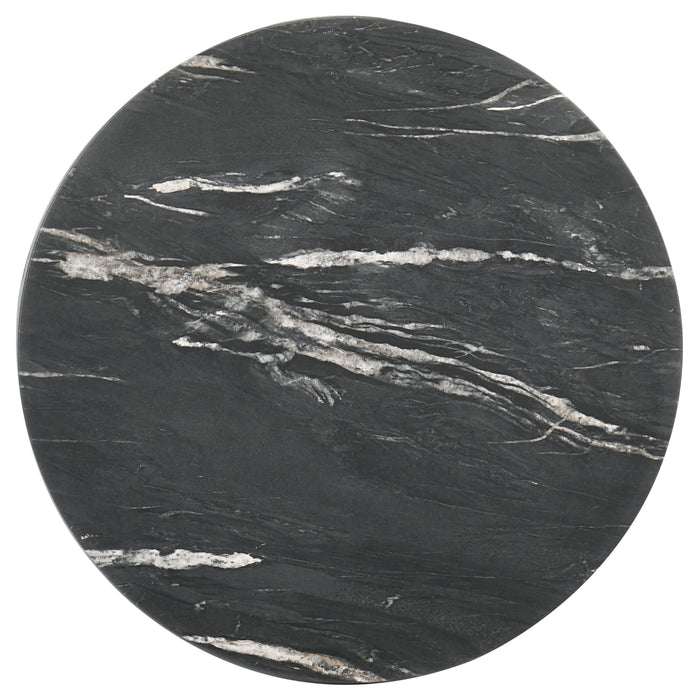This coffee table set features a black marble-like top and sturdy solid rubberwood bases in a bold black finish. The high-pressure laminate surface offers the elegance of natural stone with exceptional durability and easy maintenance. The sleek, modern design of these occasional tables blends clean lines and sculptural bases, making them a perfect addition to contemporary living rooms. This set provides both style and functionality, serving as an elegant focal point for your space.