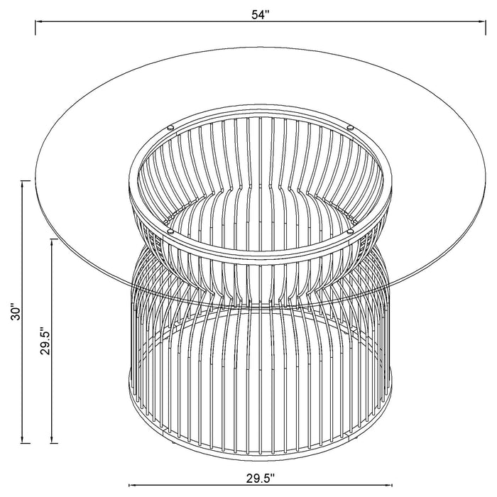 Bring bold artistry into your dining space with this round dining table, featuring a sleek clear glass top and a sculptural gunmetal base. The open, cage-style pedestal design offers a striking visual while maintaining an airy feel. Crafted from sturdy metal with a dark powder-coated finish, this contemporary table is as durable as it is stylish—perfect for modern and urban-inspired interiors.