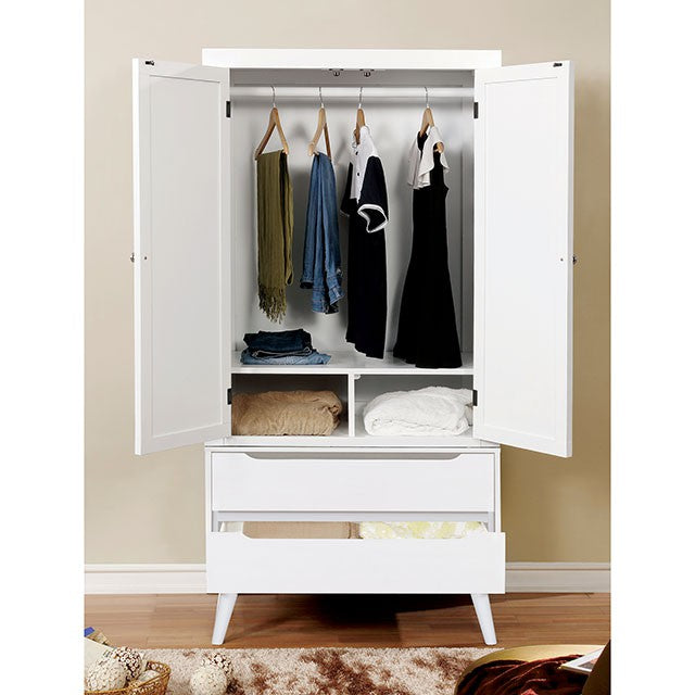 For a quick modern update to your home, this collection will add that trendy mid-century appeal. Featuring a sleek white finish and a leatherette headboard, this panel bed is complete in a platform style with an included mattress ready slat kit. Coordinating case goods boast slim flared legs and recessed handle drawer pulls. A choice of oval or rectangular wall mountable mirror completes this set.
